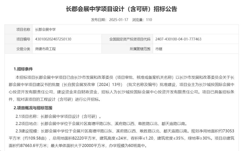 据了解,长郡会展中学项目位于长沙国际会展新城高塘坪路以东、溪府路以西、敢胜路以北、都天庙路以南,项目总用地面积约123亩,办学规模为60个班,由长沙城发集团统筹建设,预计年内启动建设,2026年建成后将移交长郡中学委托管理。该校为市教育局直属高中,面向主城区和属地招生。